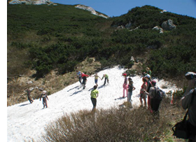 Preden smo stopili na zadnje ostanke letošnje zime, smo si v kotanjah vrtačaste oblike na severni strani gore ogledali še značilen vegetacijski obrat. Zaradi žepov hladnega zraka raste proti dnu teh kotanj vedno bolj hladnoljubno rastje, povsem v dnu je tako mrzlo, da je tam le trava.