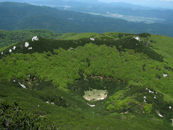 Vegetacijski obrat v vrtači oziroma mrazišču na severni strani Snežnika. (foto: MP)