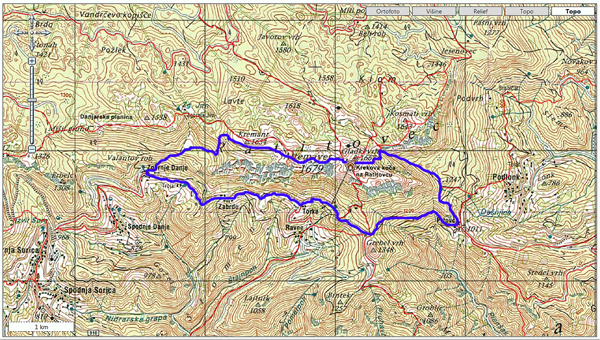 Izhodišče bo vasica Prtovč, nato pa se bomo čez Špiček in nad Razorjem ter mimo Vratc povzpeli do Krekove planinske koče tik pod Gladkim vrhom (1667 m)/1,5h. Nadaljevali bomo po vršnem slemenu na najvišji Altemaver (1679 m) ter dalje proti zahodu v smeri Soriške planine ter sestopili pod Kremantom in mimo Spodnjega Jirna v Zgornje Danje/2h, najvišjo slovensko vas. Sledilo bo prečenje južnih pobočij po cesti prek Zabrda in Torke in nad Ravnami na sedlo Zapoden/1h, kjer nas čaka še kratek in malo bolj strm sestop nazaj v Prtovč/0,5h.