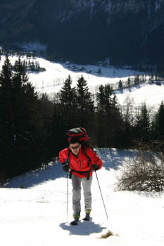 Kakšna zima … Smučar Davovega kova se mora »preganjat« po pravih »flikah« snega. |
