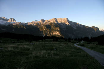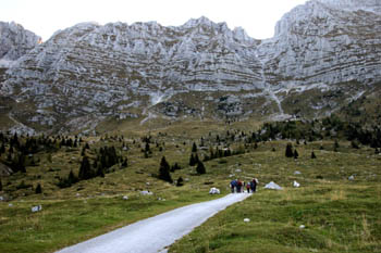 V jutranjem hladu proti koči Brazza (1660 m). Nad nami pobočje Špika Hude police (2420 m) po katerem vodi čudovita pot na vrh. |