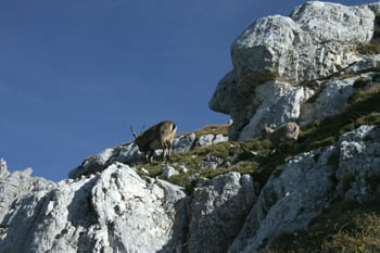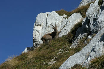 Po lepi, ne preveč strmi poti smo nadaljevali pot proti vrhu. Vmes smo poslušali žvižganje svizcev, nekje na sredini poti pa so našo pot prečkali kozorogi. Pa ne samo eden, po celem pobočju jih je bilo zelo veliko - pa še na pol udomačeni so bili, saj si jih lahko skoraj pobožal. Tik pod vrhom smo naleteli še na par flik snega in po slabih 3 urah hoje smo osvojili vrh. Razgled je bi fenomenalen, jesensko sonce nas je v brezveterju lepo grelo. Na obisk pa so seveda prišle tudi kavke. Ker se je na vrhu kmalu naredila velika gneča - skoraj taka kot v novem Mercatorjevem hipermarketu (HAHA) - smo se odpravili nazaj na planino Pecol.
