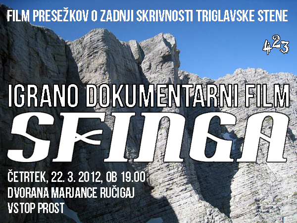 Dolgo pričakovani film Sfinga, igrano-dokumentarni film z estetskimi in dih jemajočimi posnetki, predstavi lepo in mogočno okolje simbola slovenstva z mistično Sfingo na čelu. S štirimi protagonisti obeh ključnih vzponov, ki jih ločuje obdobje treh desetletij, film na izjemno izviren način prikaže duh alpinizma in naravne lepote naših gora.