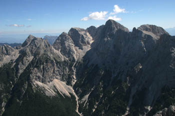 Južna pobočja Prisojnika – v ozadju sta najbolj izrazita Bavški Grintavec (levo) in Jalovec (desno) |