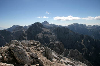 V ospredju greben, ki se vleče od Mojstrovk preko Travnika, Šit do Goličice. Levo se najviše v nebo poganja Jalovec, bolj desno vidimo Mangart, gore, ki se od njega pokažejo levo pa so rateške Ponce. |