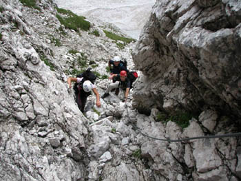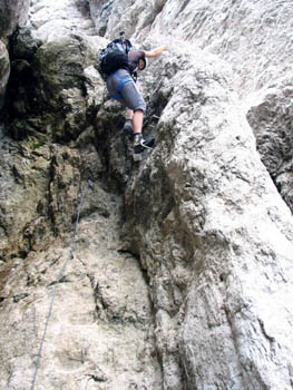 Sestopali smo po normalki proti Corsiju, nakar smo zavili levo na plezalno pot Anita Goitan. Hoja po zračnih policah, sledijo sestopi in spet vzponi na škrbine. Medtem se je že povsem zjasnilo, postalo je prav vroče, zato smo si privoščili daljši počitek. Kako je prijalo! Ko smo prišli do Trbiške škrbinice nas je čakalo neprijetno presenečenje! Bili smo prepričani, da je najhujše že za nami, a temu ni bilo tako. Sestop po izredno krušljivi grapi z nekaj potrganimi jeklenicami … Ko smo sestopili čez težji, nezavarovan skok, smo si malo oddahnili. Pa ne za dolgo! Dolina je bila še daleč spodaj, potrebno je bilo sestopiti še po ok. 20 m visoki, rahlo previsni lestvi. To pa je bilo doživetje!