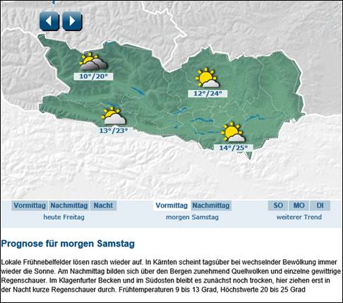 ZAMG iz prve roke (zgoraj dopoldne in besedilo, spodaj popoldne), na visokogorskih grebenih se naredijo oblaki še nekaj ur prej kot nad sredogorjem ali nad dolinami, kotlinami: