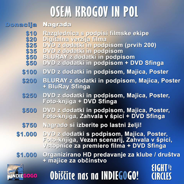 Postanite podpornik filma Osem krogov in pol. Za vsako donacijo prejmete nagrado: razglednica, DVD filma, majica, plakat, BluRay …