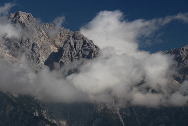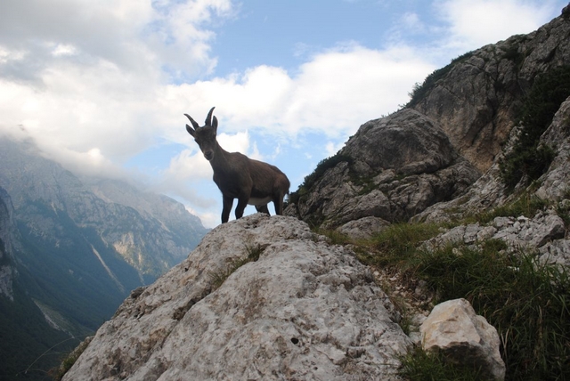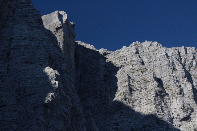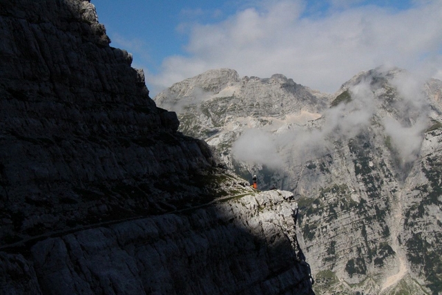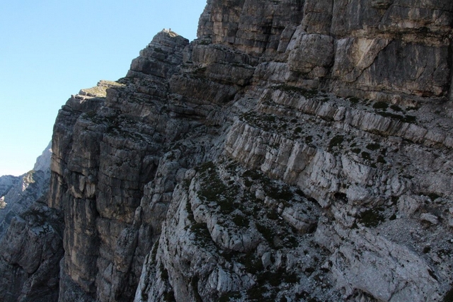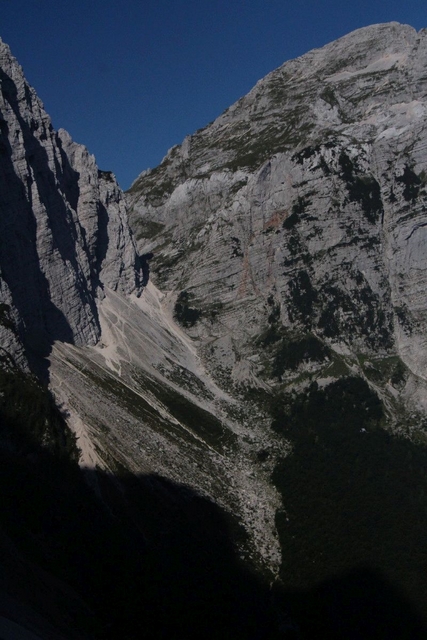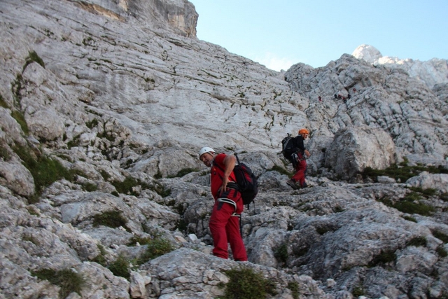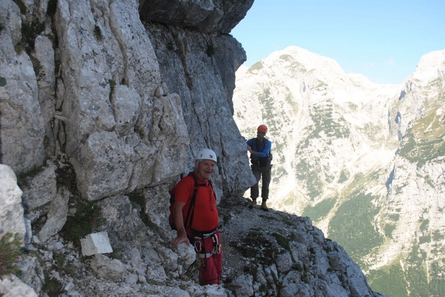 Da bom šel nekoč, sicer bolj oz. skoraj zapriseženi šodrovec in ljubitelj težjih zavarovanih poti ter lažjih brezpotij, po Slovenski sem si "godel" že nekaj desetletij, na srečo pa me je prijatelj zdaj le "odrešil" tega trpljenja (zato pa so prijatelji!). Lepo je takole pregoljufati mogočno steno prek njenih "najšibkejših" delov, seveda mora biti poleg nog in rok na mestu tudi s čelado zaščitena glava. Tudi mi smo žal nekajkrat preizkusili tovrstno zaščito, na srečo le z manjšimi padajočimi kamninskimi primerki, ki praviloma (pri-)letijo točno v smeri čelade. Zanimiva je že vstopna baletna prečka, prava uživancija pa se začne šele nad macesni, ko je skala vse bolj in bolj ta prava. Mimo Belih plati se ravno lepo ogreješ za kamin v Bučerjevi steni in počitek na Zlatorogovih policah. Tu smo ujeli prej omenjeno šesterico in se soglasno ter brez arbitraže domenili, komu pripada posamezno od težjih mest, kar nam je omogočilo lažji, hitrejši in složnejši vzpon. Če bi nas posnemali tisti, ki se gredo igrice v Piranskem zalivu, bi zadevo že zdavnaj uredili …