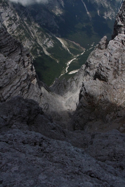 Med šodranjem po Slovenski grapi pa lahko premišljuješ, zakaj rineš gor ravno tu in zdaj ter s kom. Prevčev izhod je sicer pri roki, a mi smo bili "naštimani" na Slovenski turnc (2267 m), do katerega nam je ponagajala še mestoma "sluzasta" prečka pred oknom ter krajši spust pred Frelihovo prečnico, ki je le priprava na pogled v neskončno globino. Tega je deležen obiskovalec te smeri, ko doseže raz, ki vodi na turnc. Sledi še malo poplezavanja in krajša prečka navzdol in že smo na šodru, kjer se združita slovenska in kratka nemška smer. Pri platah ob turncu obvezna malica in potem sestop po robu SZ robu Triglavskih podov. Tu so še pred poldrugim stoletjem prek stene občasno padali kosi ledu oz. nekdaj vse do tja segajočega Triglavskega ledenika. Morda pomisli na to kdo od "izplezancev" med prečenjem polkrožnega gruščnatega morenskega nasipa, ki kaže, do kam je segal ledenik na višku male ledene dobe. Množice, ki se valijo v obe smeri po triglavski magistrali Vrata–Kredarica si s tem gotovo ne belijo glave. Ko se ob Triglavski Bistrici spet osvežiš in pogledaš celo prehojeno oz. preplezano zanko, je občutek res nezemeljski, sploh ob dejstvu, da boš kmalu na koncu poti, cilji pa seveda ostajajo. In prijatelji, ki te presenetijo z darilom z veliko začetnico – hvala Andrej!
