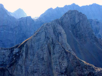 Na nasprotni strani doline se kažejo mikavni cilji: greben z Begunjskega vrha na Cmir, zadaj Visoka Vrbanova špica, čisto zadaj pa Rjavina. |