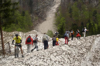 Za konec smo si ogledali še snežni plaz v čmaževki, malo nad Žagano pečjo. V zadnjih dneh je plaz, ki je prišel izpod čmaževskega turna po grapi, imenovani čmaževski plaz do kraja, imenovanega čmaževka (tam je sedaj veliko divjega česna, imenovanega čemaž ali po čmaž) ena največjih atrakcij v dolini – ostanke snežnega plazu, ki je zaprl cesto v Konec pač ne vidiš vsak dan ...
