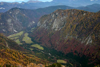Začetek poti v dolini Kot – nad glavami pa velikani Luknja peč in Rjavina. |