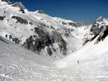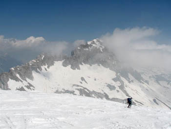 Uživamo zadnje trenutke turnosmučarske sezone! Z Nevejskega prevala smo se odpravili proti koči Rif. Gilberti, kjer smo se ločili. Dva dolenjska prijatelja sta se napotila proti Prestreljenikovemu oknu, trije smo šli preko Prevale proti Prestreljeniku (2499 m). Na vrh sva se povzpela midva z Bogdano. Z vrha sem odsmučal vzhodno pobočje Prestreljenika (III+, S4). Bila je malce pozna ura, vendar temperaturam primerna smuka. Tako na kaninski strani kot nad Nevejskim sedlom je snega še ogromno, pobočja so na debelo zalita s snegom. Peš hoje do avta je bilo za ok. 2. minuti. Fletno, ni kaj!