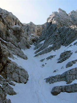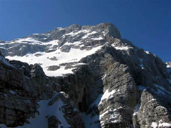 Triglav - po snežišču (v soncu) pod robom stene poteka znamenita Frelihova prečnica |