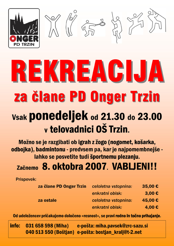 V ponedeljek, 15. 10. 2007 se zvečer (termin od 21.30 – 23.00) že drugič dobimo na rekreaciji za člane PD Onger Trzin. Vsak ponedeljek zvečer počnemo marsikaj: Igramo nogomet, košarko – predvsem pa se lahko posvetimo plezanju po umetni plezalni steni. Vabljeni!