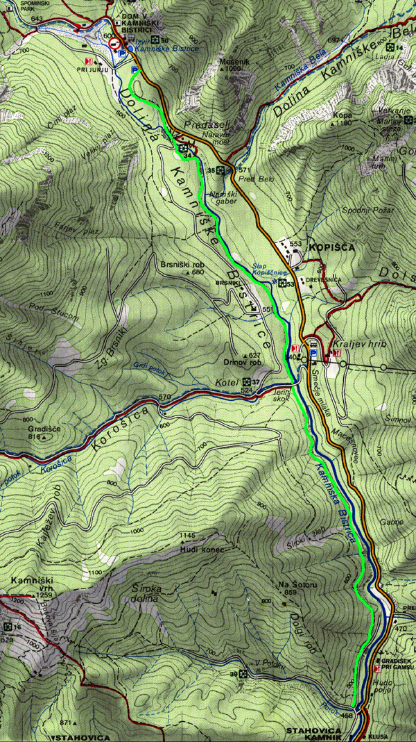 Izlet bomo pričeli pri mostu čez Kamniško Bistrico na koncu kamnoloma kalcita v Zg. Stahovici (Iverje) (458 m), kjer se prične zgornji del Koželjeve učne poti. Od tu bomo sledili toku Kamniške Bistrice proti njenemu izviru v Kamniški Bistrici. Steza je razgibana – po njej se dvigamo in spuščamo ter prečkamo nekaj potočkov vse do Ribje peči. Tu se ponovno dvignemo in po spustu prispemo na gozdno cesto, ki vodi od spodnje postaje nihalke v dolino Korošice. Naša pot nato sledi toku Kamniške Bistrice, mimo slapu Kopiščnice vse do soteske Malega Predaslja. Tam se vzpnemo in v loku obkrožimo majhno razširitev soteske ter čez lesen mostiček nad zagozdenim kamnom (naravni most – Veliki Predaselj) preidemo na drugi breg Kamniške Bistrice. Po gozdni stezi prispemo do gozdne ceste in betonskega mostu čez sotesko Predaselj. Soteska sodi med najzanimivejše dele Kamniške Bistrice, kjer si je reka zarezala več kot 100 metrov dolgo, do 35 metrov globoko in le nekaj metrov široko sotesko.