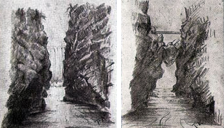 LEVO: Slap v Malem Predaslju do 26. 10. 1952, ki je za vodnim zastorom skrival resnico o svojem nastanku. DESNO: Mali Predaselj po 26. 10. 1952: Slap je izginil, pokazala se je zagozdena skala - drugi naravni most -, 200 sežnjev zagozdenega lesa in okoli 4000 kubičnih metrov proda je voda odnesla. Risal: Pavel Kunaver