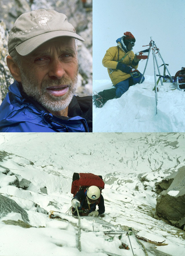 Zgoraj: Andrej Štremfelj (levo), Nejc Zaplotnik ob kitajski piramidi na vrhu Everesta leta 1979 (desno), spodaj strma stopnja na poti proti vrhu