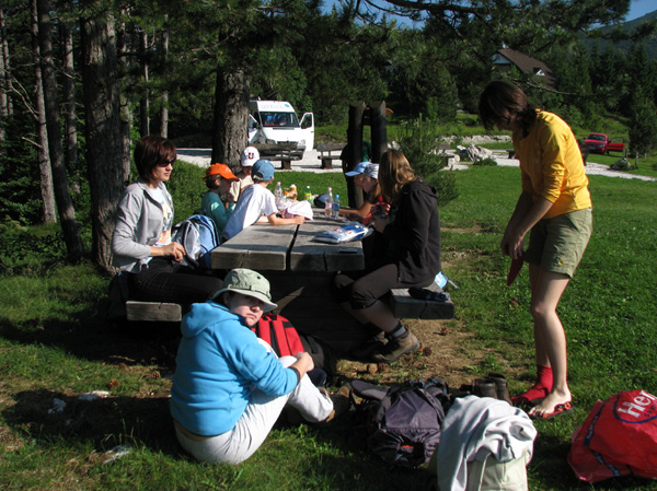 Za zaključek šolskega leta smo si privoščili malo več. Najeli smo kombi za 20 oseb, ki nam ga je skoraj uspelo do zadnjega sedeža napolniti. Verjamem, da nam ga naslednjič zagotovo bo, saj je bilo super udobno in ugodno. Obetala se nam je vroča in sončna nedelja, zato smo se odpeljali na Primorsko, brez kopalk in plavutk temveč s planinsko opremo. Do Ajdovščine sva z Mihom naredila končni plan poti ter izbrala glede na vremenske razmere bolj senčno varianto. Najprej pa zajtrk na razgledišču, kjer se začne pot po robu Gore (namig za družinski izlet).