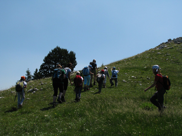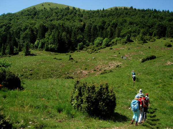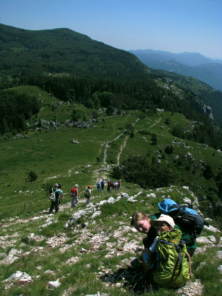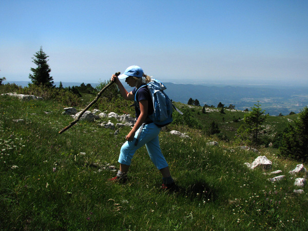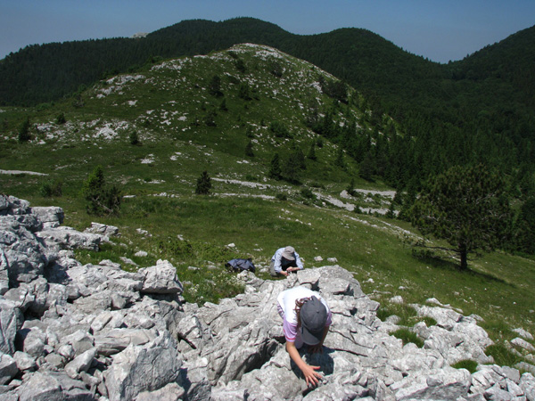 Vijugali smo po gozdnih cestah, opazovali vrtače, se čudili podrtemu gozdu, kar naenkrat pa se je pred nami pokonci postavil piramidasti vrh. Vendar kako do njega, saj smo že ves čas hodili po nemarkirani poti? Samo za Mihom, pa bo. Vodil nas je čez opuščene pašnike, ki so sedaj domovanja kač in ostalih sonceljubnih živali, do gozdička, kjer smo si privoščili malico, saj se na vrhu ne bi bilo varno izpostavljati sončnim žarkom. Sledilo je še fotografiranje vseh vrst cvetic, največ med njimi za noht majhnih planik. Na vrhu smo spoznali, da zna biti opazovanje morja tudi prijetno in osvežujoče, saj je pihljal rahel vetrič. S pogledom smo premerili nekdanje in sedanje slovensko ozemlje. Ob malo bolj čistem ozračju, bi lahko prešteli tudi ladje v Tržaškem zalivu.