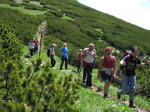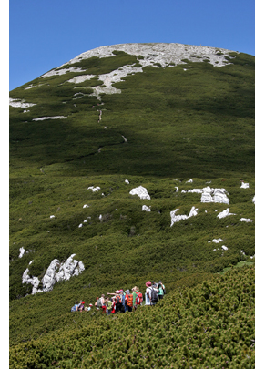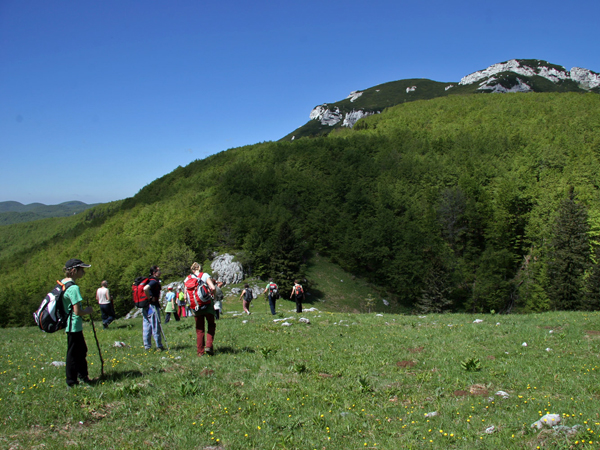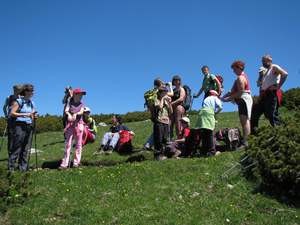 Malo po poldnevu, po dveh urah hoje in premaganih 600 višinskih metrih, je naša skoraj četrt stotnije velika četica, zavzela položaje okrog nekaj manj kot 1800 metrov visokega vrha in bližnje planinske koče ter začela najlepši del ture - počitek z malico in razgledovanjem. Nekdo je sicer omenil krst, a je na srečo ostalo le pri besedah, čeprav bi si tudi zavojevalci primorsko notranjskega Triglava zaslužili njegovo izvedbo … Po debeli uri višinskega odmora in vsega, kar spada poleg (žigi, jota, vpisna knjiga, »dolce vita«, sončenje, zavitek, foto »sešn« idr.) smo zdirjali navzdol proti zahodu, natančneje proti Malemu Snežniku.