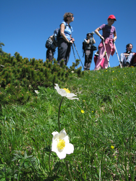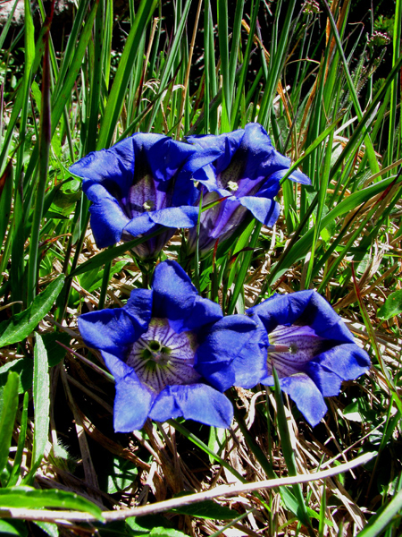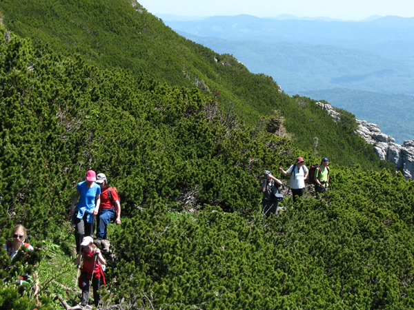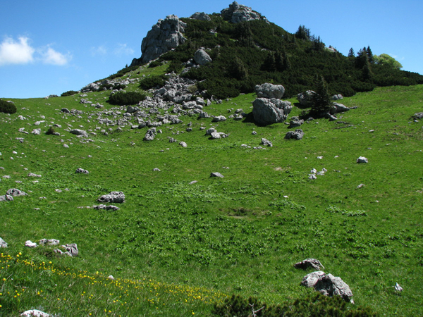 Že po slabi uri smo skozi bukove krošnje zagledali naš cilj, obvozili par vrtač in kotanj ter se malo za ostanki nekdanje koče pod Snežnikom zagrizli še v ruševnate strmine. Tam so se gozdni zeleni pridružili še odtenki drugih barv, najbolj je strigla sinja modrina svišča (naši severni sosedje mu sicer rečejo encijan …), ki pa je bila zelo skladna z nebesno nad nami. Oblakov le za vzorec, sonce pa junijski višini primerno, torej žgoče. Migotanje vročega zraka med ruševjem je motil zmerni severovzhodnik, ki pa je hkrati hladil tudi naša, proti vrhu že precej pregreta telesa.