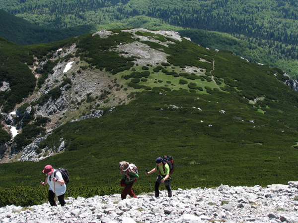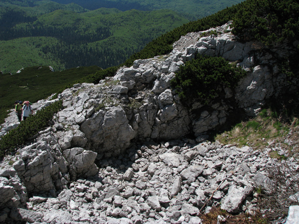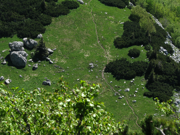 V lahnem bukovem (pozor, gre za trd les!) drncu navzdol, smo hitro našli listnat žleb (imenuje se Žlebina), kjer je še pred tednom ali dvema ležal sneg. Bolj pomembno pa je bilo, da je nekdaj po njemu vodila markirana planinska pot in to celo znamenita E-6, o čemer so pričale že povsem obledele markacije.