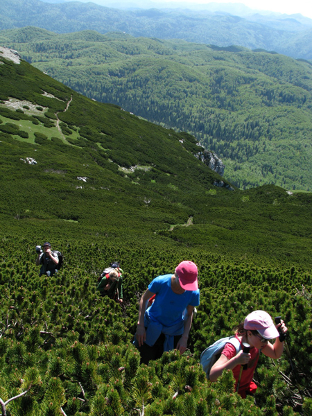 Preden smo stopili na zadnje ostanke letošnje zime, smo si v kotanjah vrtačaste oblike na severni strani gore ogledali še značilen vegetacijski obrat. Zaradi žepov hladnega zraka raste proti dnu teh kotanj vedno bolj hladnoljubno rastje, povsem v dnu je tako mrzlo, da je tam le trava.
