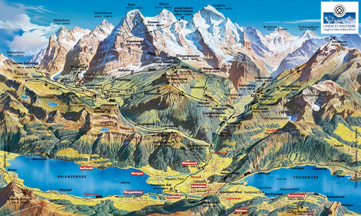 Znamenitost Švice so tudi zobate železnice. Najbolj znana proga pa je ravno ta, ki potnike v dveh urah in pol pripelje iz Lauterbrunnena v Wengen in skozi Eiger na sedlo Jungfraujoch med goro Jungfrau (4158 m) in Mönch (4107 m) na nadmorsko višino 3454 metrov.