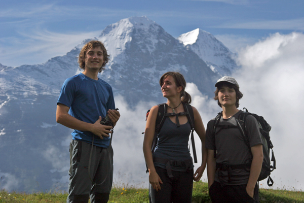 Jaka, Špela in Matevž pozirajo, v ozadju pa se vidi Eiger in Mönch.