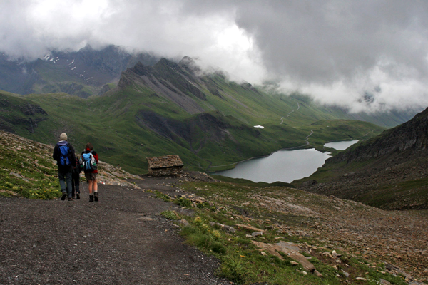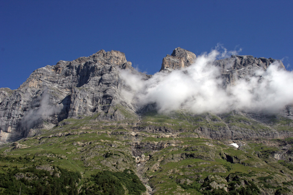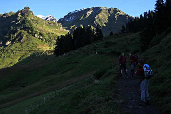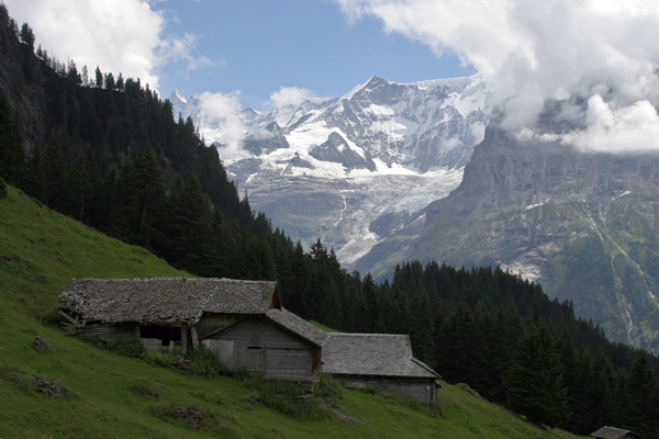 Pot v dolino (v Grindelwald) nas je nato vodila mimo številnih planin. Na eni izmed njih smo občudovali svizce (ki niso zavijali čokolade v folijo) ter na vsake toliko časa skozi oblake uzrli kakšnega izmed "velikanov" nad Grindelwaldom (v ozadju se vidi Barglistock, 3656 m).