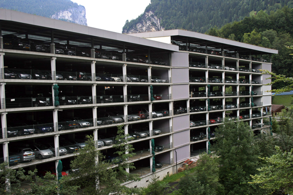 Švicarji znajo vsako stvar dobro zaračunati, ampak parkiranje v 8-nadstropni garažni hiša pa ni bilo drago. So pa Švicarji izjemno dobri arhitekti, saj jim je uspelo garažno hišo v Lauterbrunnenu zgraditi tako, da še opaziš ne, da si prišel v drugo nadstropje ...