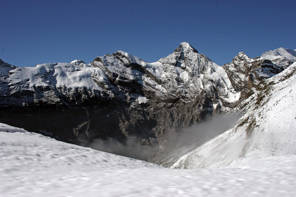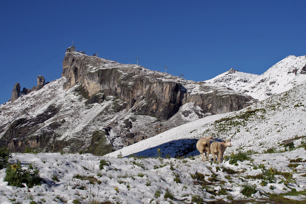 Ker je prejšnji dan snežilo, so se tudi ovce skorajda skrile v sneg, mi pa smo se vzpenjali mimo Birga (2677 m) in naprej proti Schilthornu, ki se je že videl v daljavi.