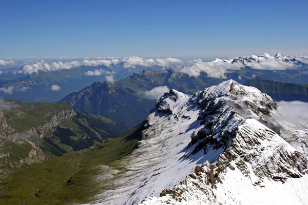 Na vrhu smo videli tudi na drugo stran. Nad vasico Saxten se je vzpenjal Bietenhorn (prvi vrh), v ozadju pa je bil greben gora, ki se začne s Faulhornom in konča s Schwarzhornom.