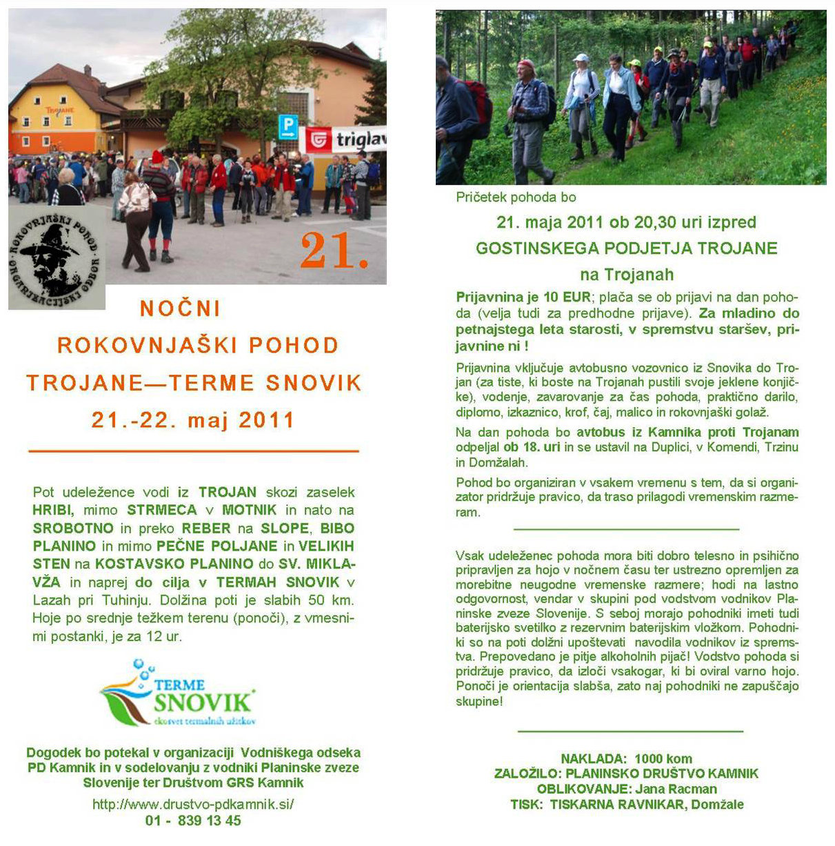 Pričel se bo v soboto, 21. maja, ob 20.30 pred Gostinskim podjetjem Trojane na Trojanah Pot nas bo vodila iz Trojan preko Lipovca, Male Ravni, Strmeca, Motnika na Srobotno in preko Reber na Slope, Bibo planino in mimo Pečne Poljane in Velikih Sten na Kostavško planino do Sv. Miklavža in naprej vse do cilja v Termah Snovik (v Lazah pri Tuhinju).