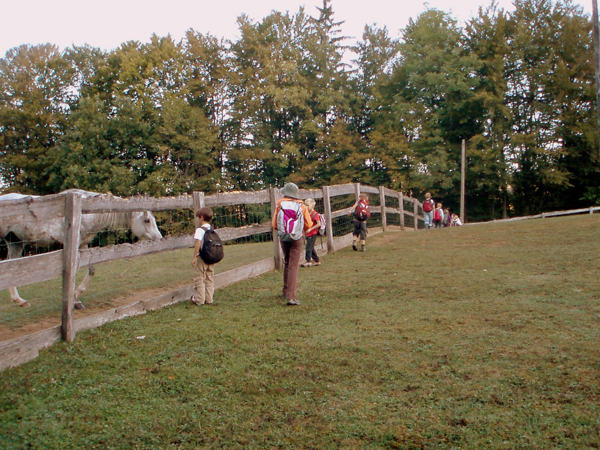 Pot nas je kmalu popeljala čez travnik, kjer so nas pozdravili konji.