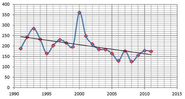 1991: 188 1992: 243 1993: 284 1994: 232 1995: 164 1996: 203 1997: 230 1998: 215 1999: 196 2000: 361 2001: 248 2002: 209 2003: 184 2004: 183 2005: 164 2006: 129 2007: 176 2008: 125 2009: 155 2010: 178 2011: 174 ------------ Sk.: 4241