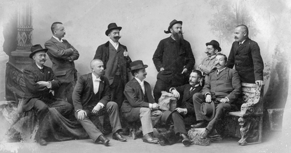 Nekateri glavni funkcionarji Slovenskega planinskega društva, okrog leta 1898. V drugi vrsti z leve Anton Mikuš, urednik Planinskega vestnika in prvi tajnik SPD, Ivan Ogorevc, trgovec in podpornik SPD, Miha Verovšek, piparski pripravnik in tajnik SPD, Josip Hauptman, nadpipar in glavni tajnik SPD, prof. Ivan Macher, prirodoslovec in odbornik pri znanstvenem delu SPD. V prvi vrsti z leve Jan Polivka, vojaški uradnik in aranžer prvega planinskega plesa, Slavik, vojaški in agilen član SPD, dr. Vladimir Foerster, blagajnik SPD, zveza med Slovenci in čehi, Henrik Lindtner, pipar, revizor in odbornik SPD, prof. Fran Orožen, prvi predsednik SPD in najagilnejši dan pri znanstvenem delu SPD. (arhiv PZS/Slovenski planinski muzej)