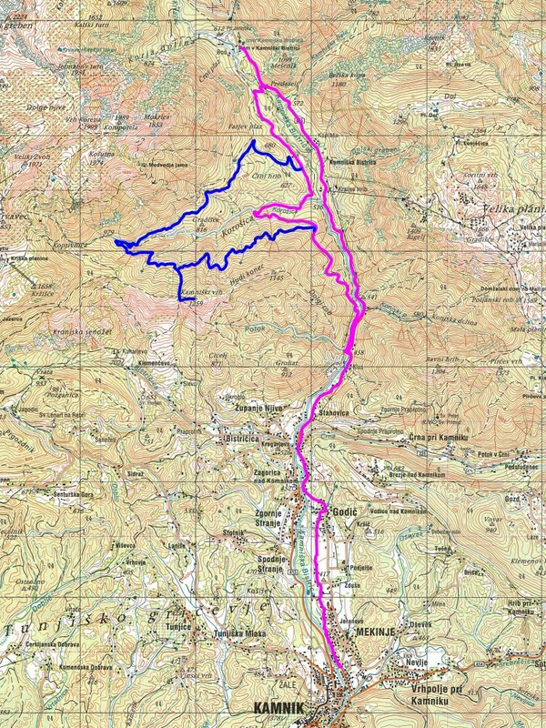 680 m vzpona s kolesom in 300 m vzpona peš na Kamniški vrh (1259 m), 38 km, V4, S3 (vijolična in modra pot)
