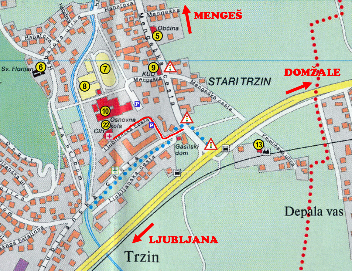Zemljevid (parkirišča) - večji zemljevid (Manjši parkirišči sta še pri Občini Trzin in za stavbo KUD.)