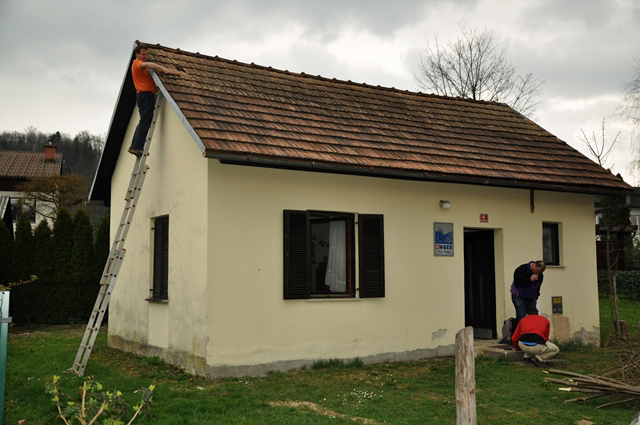 Po izletu pa so se Miha, Rado, Miro in Emil odpravili še do naše planinske hišice, kjer je nekaj dotrajanih in premaknjenih strešnikov moralo svoje mesto odstopiti malo boljšim (a enako starim) strešnikom. Je pa jasno, da bo na dan čistilne akcije skupina planincev tokrat ostala v hišici (kot to prakticirajo pri gasilcih, pa športnikih ...) in jo dodobra očistila.
