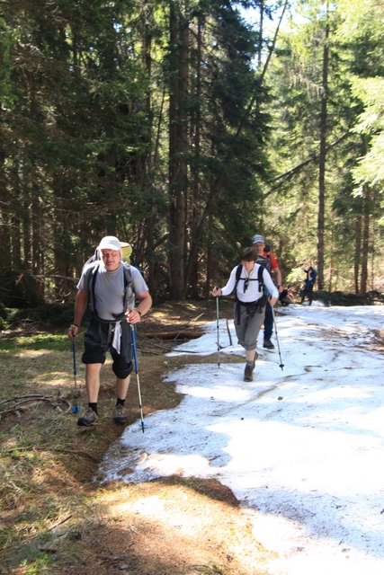 Ob osmi uri je skupina šestih planincev - od tega dva mlajša mladinca in štirje "mladinci" - zastavila pot po cik-cakasti gozdni cesti proti planini Ravna. Nekje na polovici poti do planine (tam smo na poti do vrha srečali tudi edinega planinca …) se odcepi planinska pot, ki skrajša zadnje serpentine. Že med potjo, še bolj pa na planini (Razgled z veliko začetnico!) se je že kazalo nadaljevanje naše poti proti grebenu Strehice. Pri slikoviti kapelici tik nad planino – tu se z desne pridruži pot z Naborjeta – natančneje malo naprej v macesnovem gozdu, so nas že pričakale prve snežne zaplate, med njimi pa cvetje in bujno zelenje kipečega spomladanskega drevja. Težak sneg je tudi tu naredil svoje, tako s podrtim drevjem kot zaradi erozije vode (pred kratkim taleči se sneg) mestoma uničeno potjo. In prav na gozdni meji, ko se začne najlepše, tudi sledovi človeške neumnosti iz 1. svetovne vojne. V zatrepu Koroškega kota (tega imena ni na zemljevidu …) pa že prva obsežnejša, a tod še ne preveč strma snežišča. Prečkali smo jih tako, da smo bil čim manj časa na snegu, saj so zdrsi zelo nevarni, še posebej, če se končajo nižje na melišču …