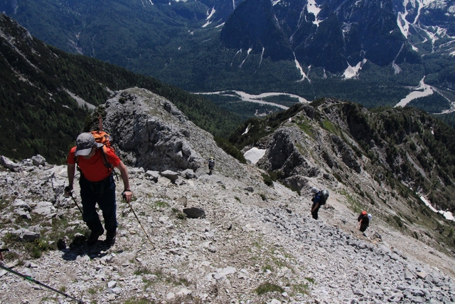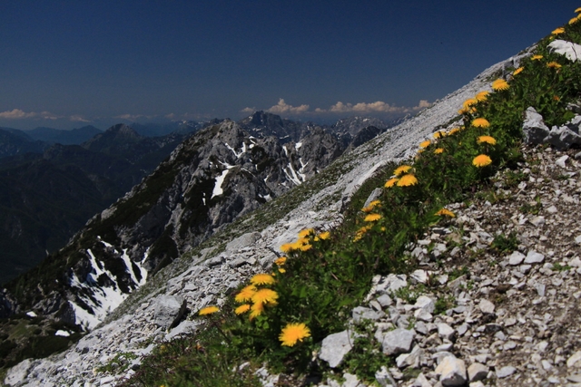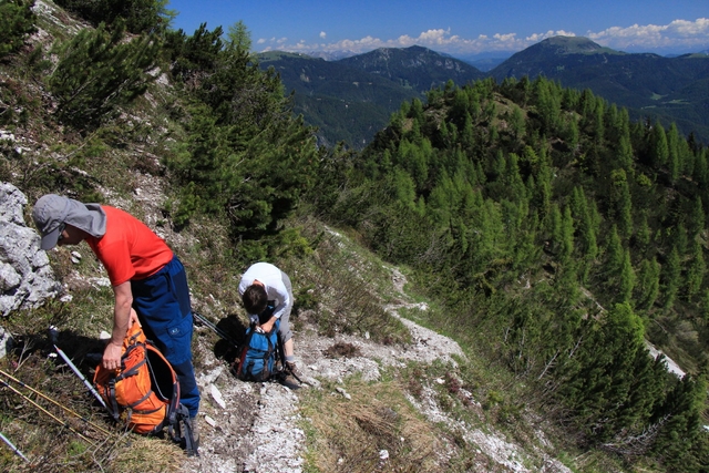 Po snežnem grizenju kolen smo se znašli na "frontnem" grebenu tik pod vrhom in že zadnjič zagrizli v strmino, da bi malo čez poldne po nekaj več kot štirih urah "zmagoslavno" stopili na sam vrh. In tam zgoraj je v lepem vremenu in dobri vidljivosti kaj videti! Le redko lahko s take višine (2087 m) vidimo toliko in tako daleč. O sprva zoprnem povratku po razdrtem dolomitnem svetu po južni strani, kjer smo dobesedno bežali pred soncem, ki je napovedoval prihod vročine, ne kaže kaj dosti pisati. Kmalu smo bili v varnem, predvsem pa senčnem zavetju gozda iz katerega smo izstopili šele na sedlu Rudni vrh, ki ločuje dolini Dunje in Zajzere. Pot nas je vodila še mimo koče Grego, od koder smo se lahko še enkrat več ozrli proti bližnjim Višarjam, v "senci" katerih smo pohajali ves dan. Še strm spust in že smo bili v dolini, po skoraj 13 prehojenih kilometrih, kolikor je kazala GPS naprava naše vrhovne markacistke Andreje.