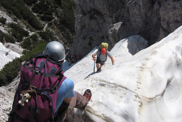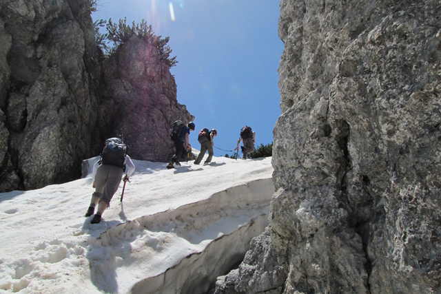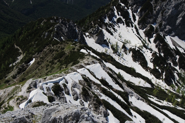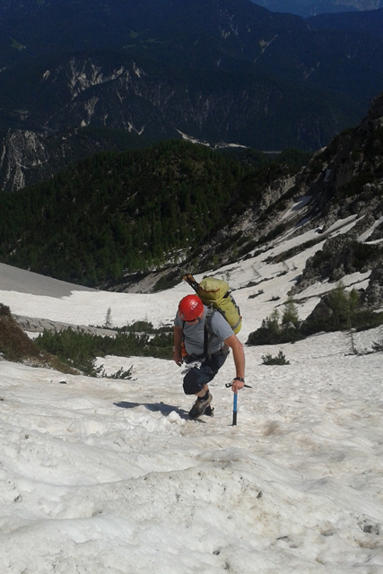 Na okrog 1900 m smo po prvem grizenju kolen dosegli greben Strehica–Poldašnja špica in pred nami sta se kar naenkrat postavila pokonci skoraj kilometer (!) višja mogočnika Zahodnih Julijcev – Viš in Poliški špik (Montaž) in njuni nič kaj dosti nižji sosedi – prav vsi pa na tej, osojni strani, še na debelo obloženi s snegovjem. Sledil je spust na manjše sedelce, potem pa dve prečenji strmih, a na srečo še razmehčanih snežišč. Čez prvega, ki ni imel nič kaj prijeten iztek s skokom, smo naredili kratko vrvno ograjo, čez drugega pa le dobro "vklesane" stopinje. V rokah pa seveda cepini in na glavah čelade.