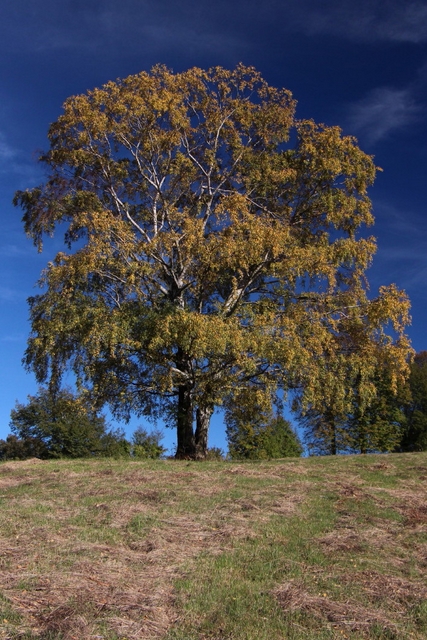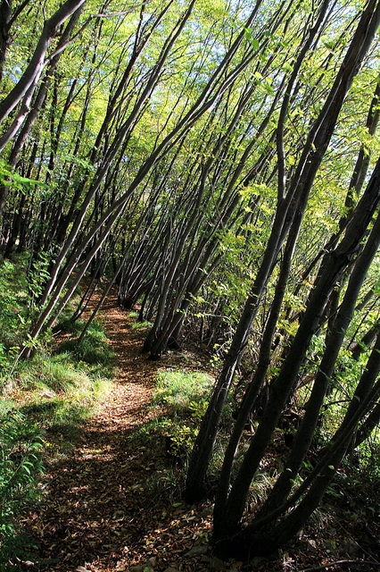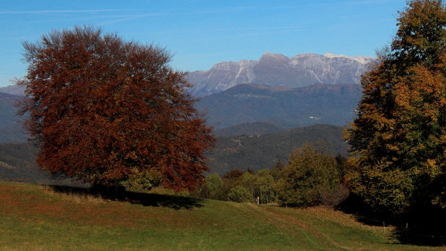 Jesenske bukve niso videti prav nič "trde & sive", zadaj travnata strmal Krna.