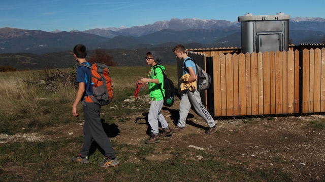 Nova točka kombinirane geodetske mreže (več nahttp://www.geodetski-vestnik.com/58/4/gv58-4_medved.pdf) in trije vrli dijaki. Za zadnjim od njih pa travnati Krn!