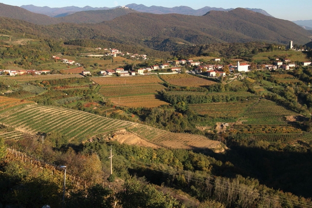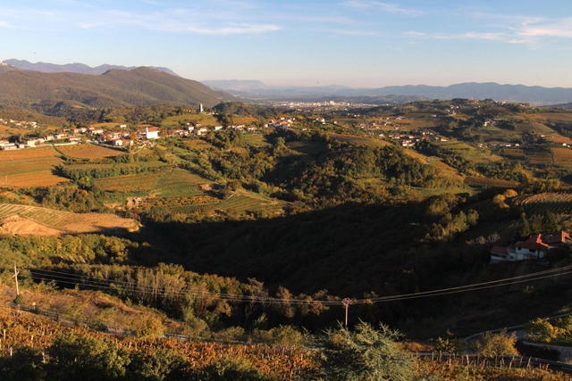 Vzhodni del Brd, v ozadju Nova Gorica v večernem soncu oz. z razglednega stolpa v Gonjačah.