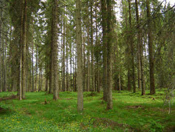 Skočimo še nekaj "lučajev stran" (slike posnete 19. 6.): Pokljuka, kot si jo običajno predstavljamo: ravna drevesna debla, bogata podrast, kar malo kičasto ... |
