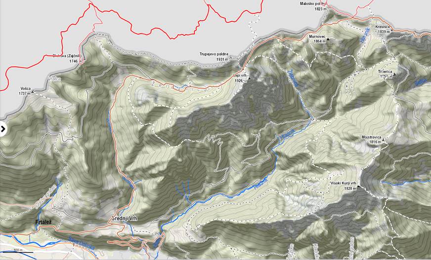 »Graničarske stezice Zahodnih Karavank« Srednji Vrh (Martuljek)–ob potoku Jerman–dolina Železnica–Trupejevo in Maloško poldne–Grajska planina–lovska koča Hladnik–gozdna cesta po dolini potoka Hladnik–Srednji Vrh